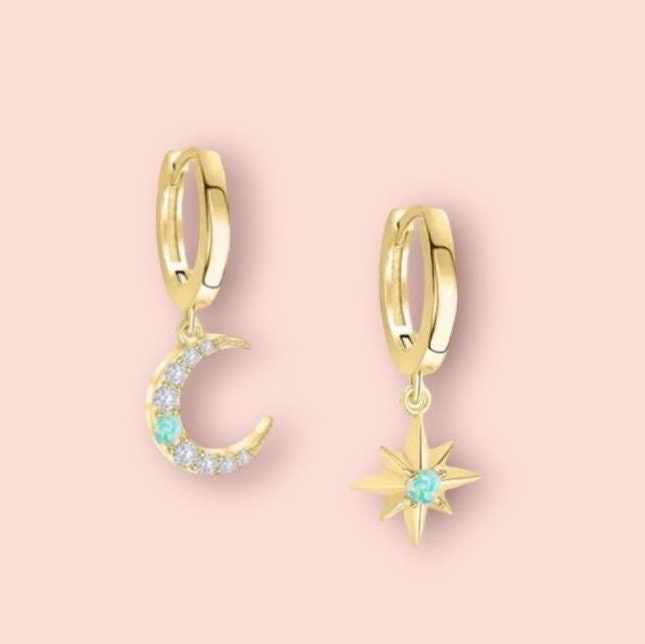 18K Gold Plated Huggies hoop Moon & Star cubic zirconia turquoise opal stone charm Earrings dangly