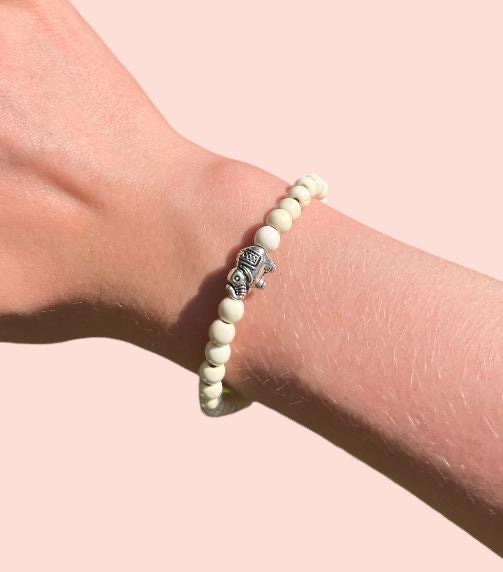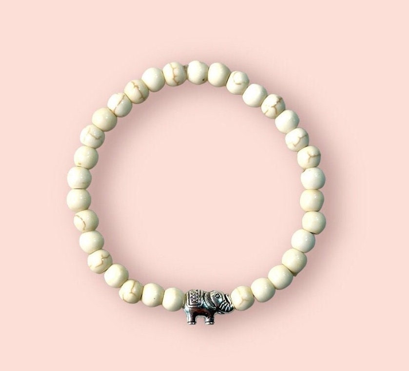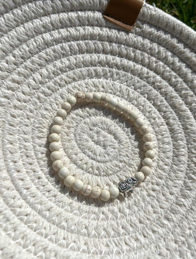 Handcrafted with natural stone beads, elephant charms and stretchy elastic!