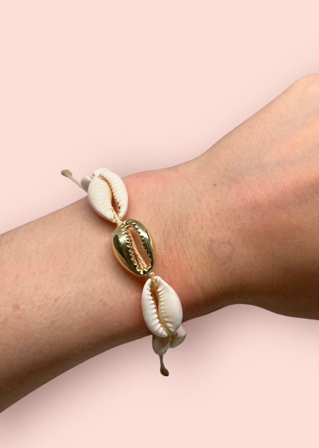 Handcrafted with quality cowrie shells (plain & 14K gold plated) and nude/white wax string.
