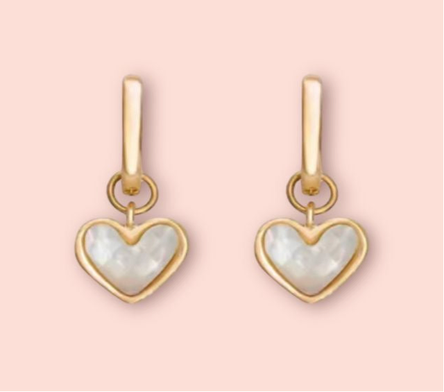 Gorgeous 18K Gold Plated Heart Huggies earrings with a white polished shell heart charm!
